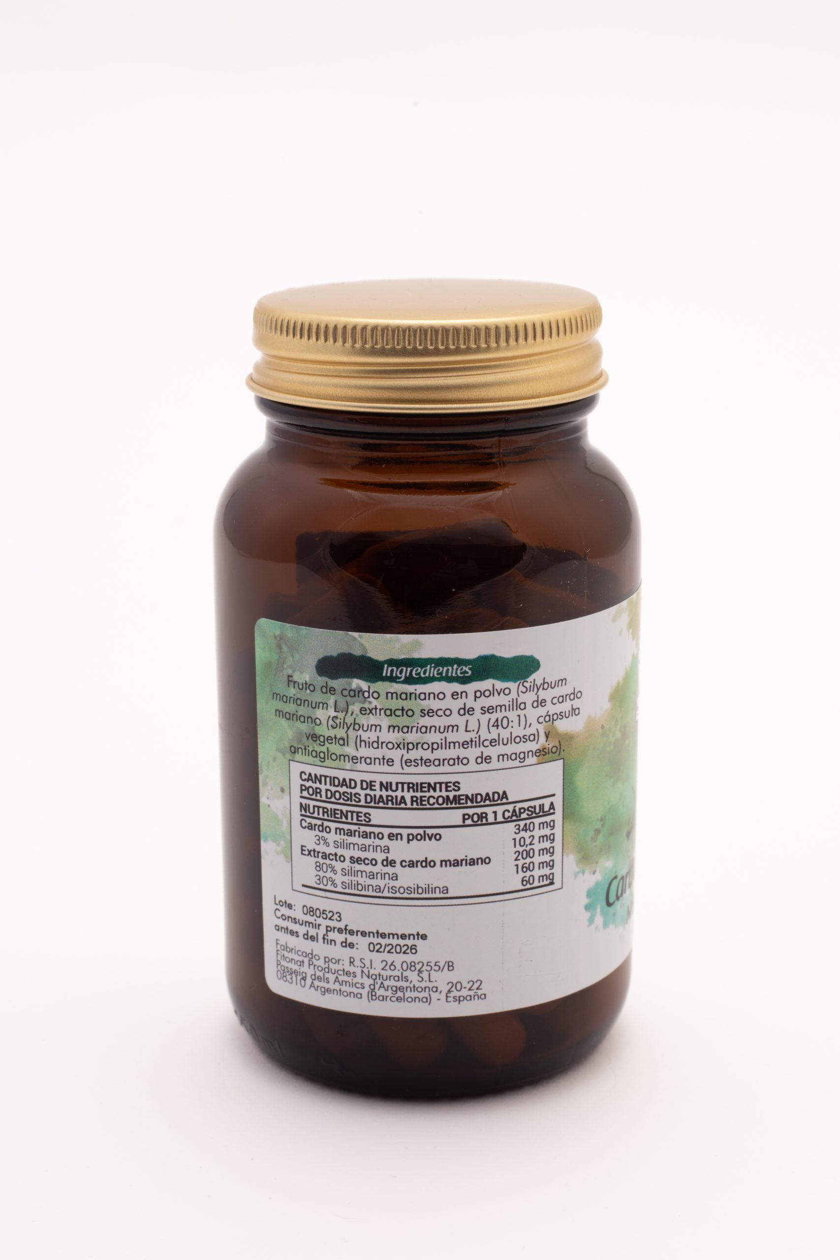 Cardo Mariano polvo 340 mg, Cardo Mariano e.s. (30:1, 80% silimarina y 30% silibina/isosilibina) 200 mg, cápsula vegetal (hipromelosa) y antiaglomerante (estearato de magnesio).