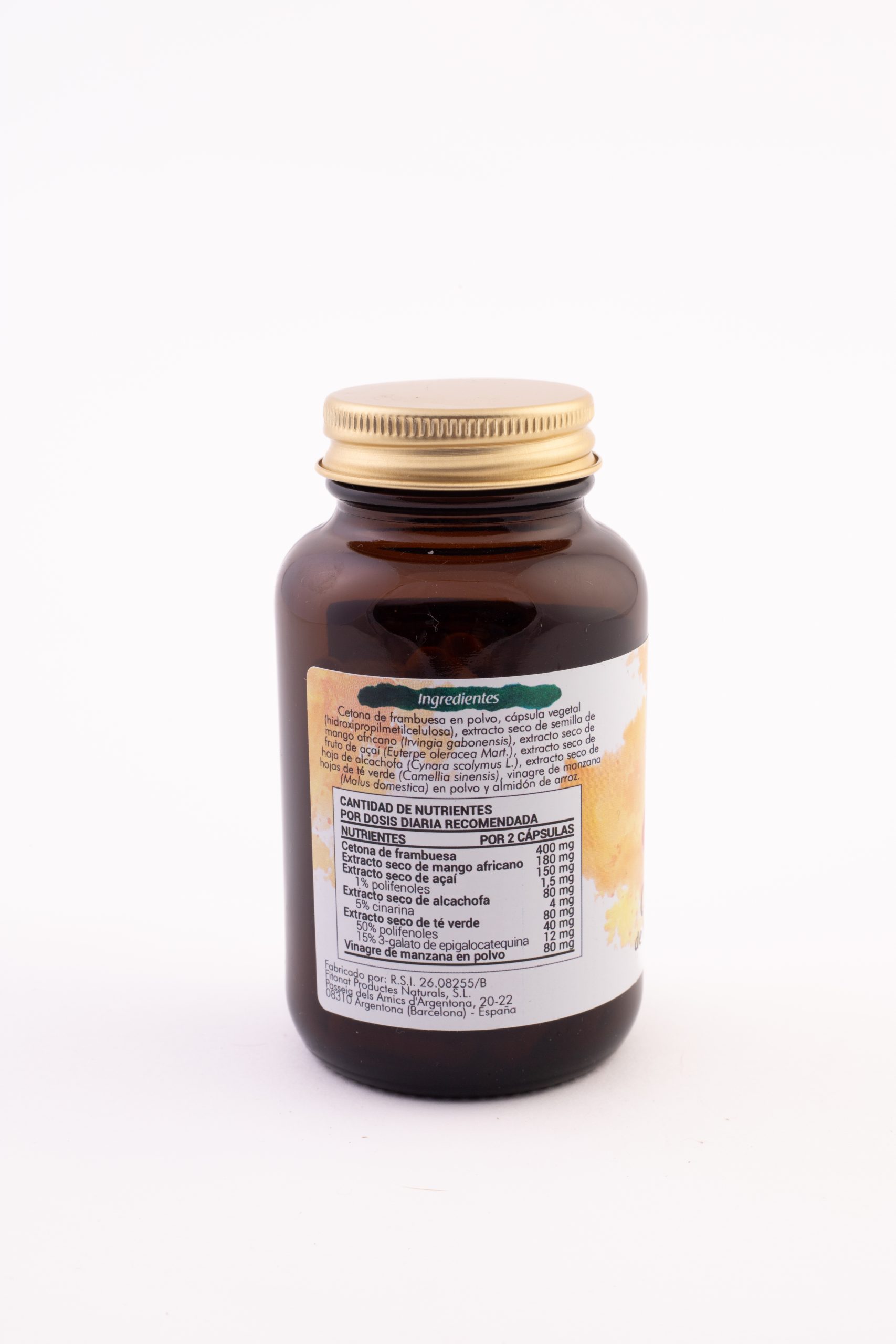 Cetona de Frambuesa 400 mg, cápsula vegetal (hipromelosa), Mango Africano e.s. (10:1) 180 mg, Açaí e.s. (8:1, 1% polifenoles) 150 mg, Alcachofa e.s. (10:1, 5% cinarina) 80 mg, Té Verde e.s. (5:1, 50% polifenoles) 80 mg, Vinagre de Manzana 80 mg y almidón de arroz 10 mg.