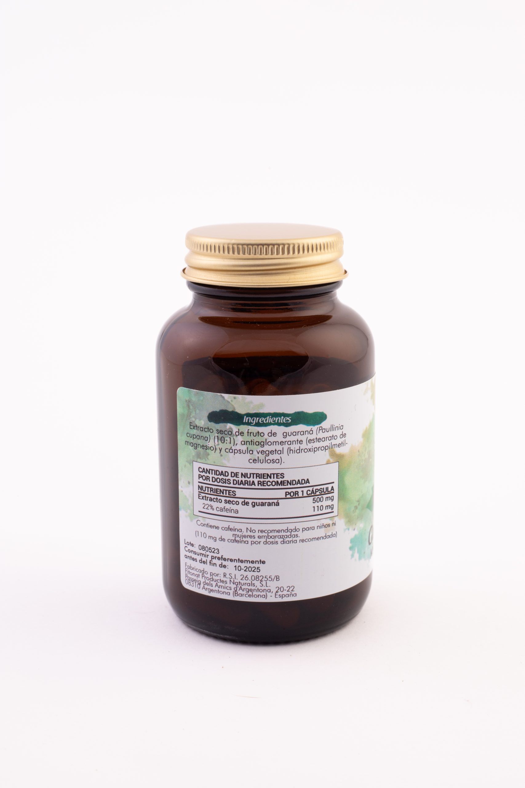 Guaraná e.s. (10:1, 22% cafeína) 500 mg, cápsula vegetal (hipromelosa) y antiaglomerante (estearato de magnesio).