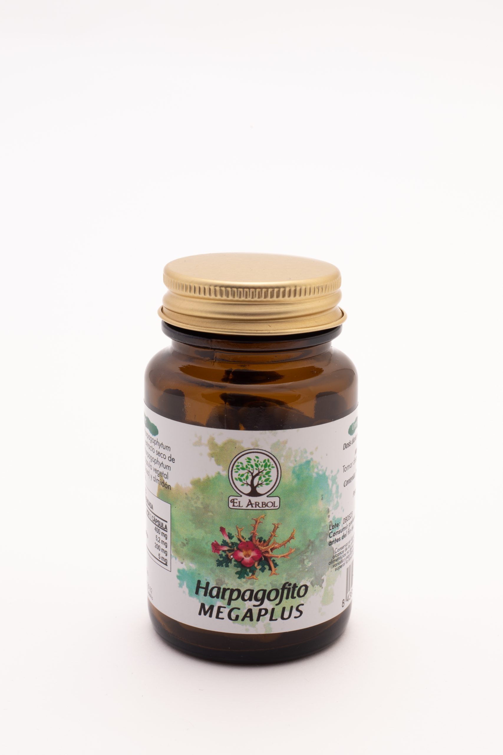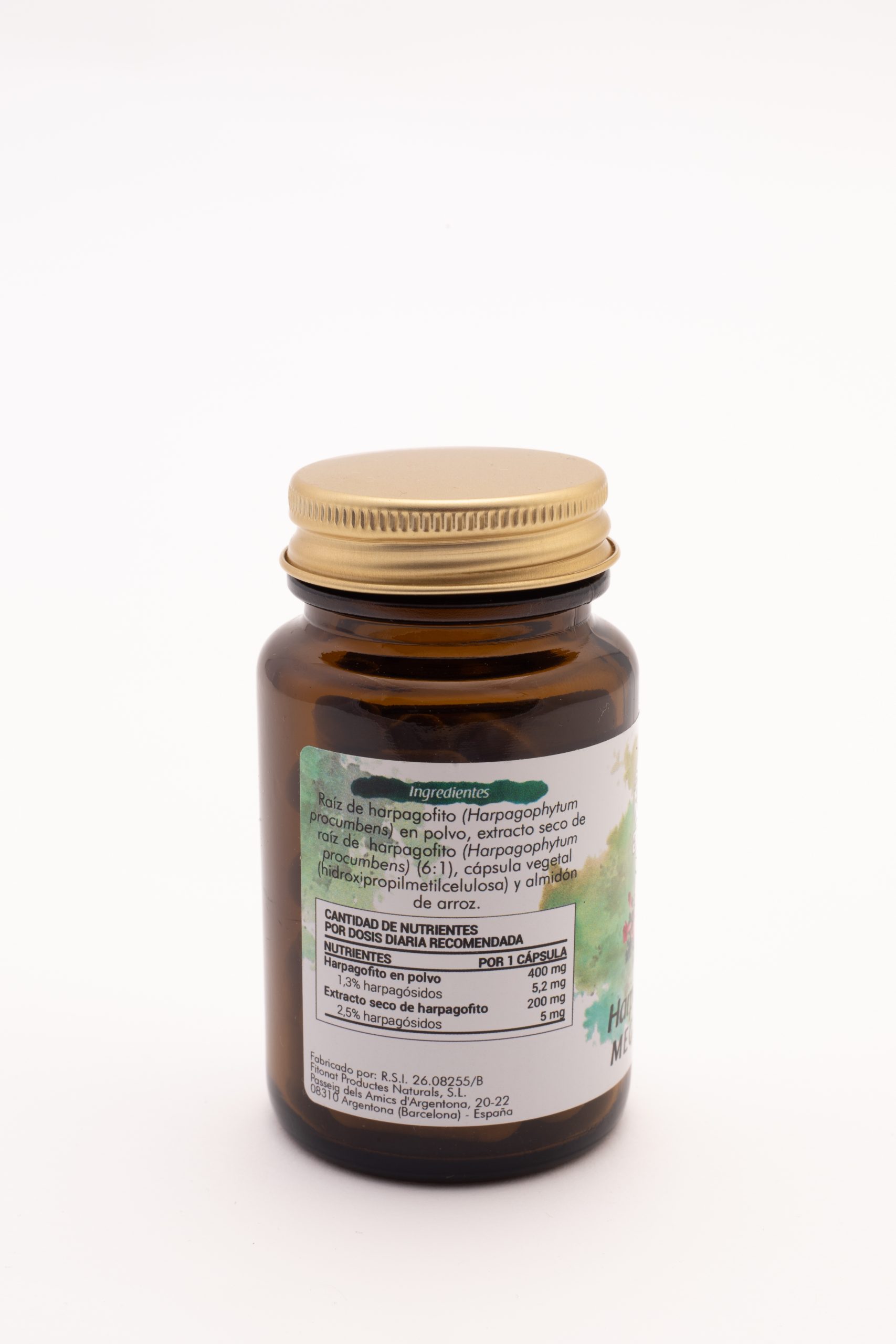 Harpagofito polvo 400 mg, Harpagofito e.s (6:1, 2,5% harpagósidos) 200 mg, cápsula vegetal (hipromelosa) y almidón de arroz 20 mg.