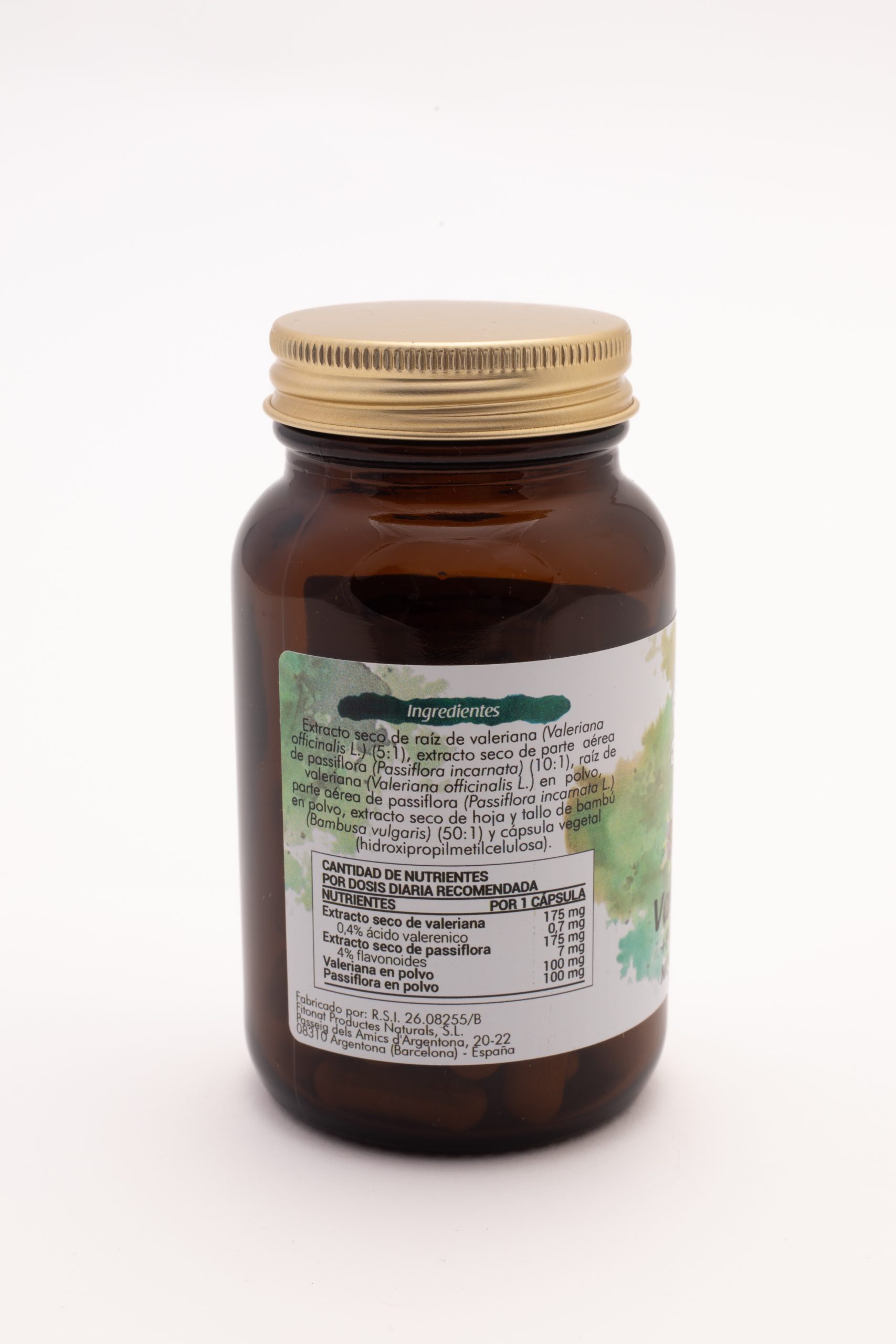 Valeriana e.s. (4:1, 0,4% ácido valerenico) 175 mg, Passiflora e.s. (10:1, 4% flavonoides) 175 mg, Valeriana polvo 100 mg, Passiflora polvo 100 mg, cápsula vegetal (hipromelosa) y antiaglomerante (almidón de arroz).