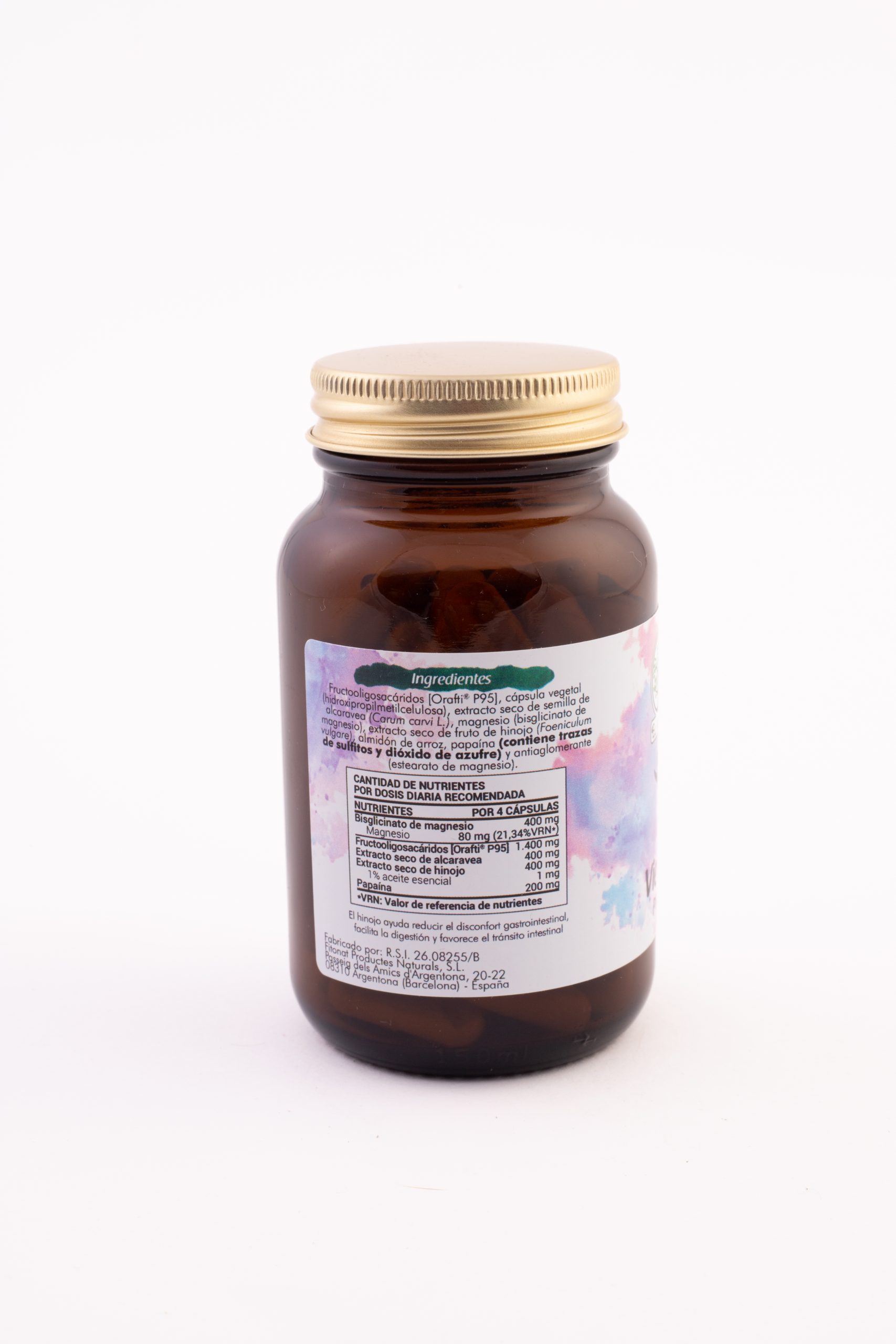 Fructooligosacáridos 1.400 mg, cápsula vegetal (hipromelosa), Alcaravea e.s. (10:1) 400 mg, Bisglicinato de Magnesio 400 mg, Hinojo e.s. (5:1, 1% aceite esencial) 400 mg, almidón de arroz 300 mg, Papaína* 200 mg y antiaglomerante (estearato de magnesio). *Contiene trazas de sulfitos y dióxido de azufre.