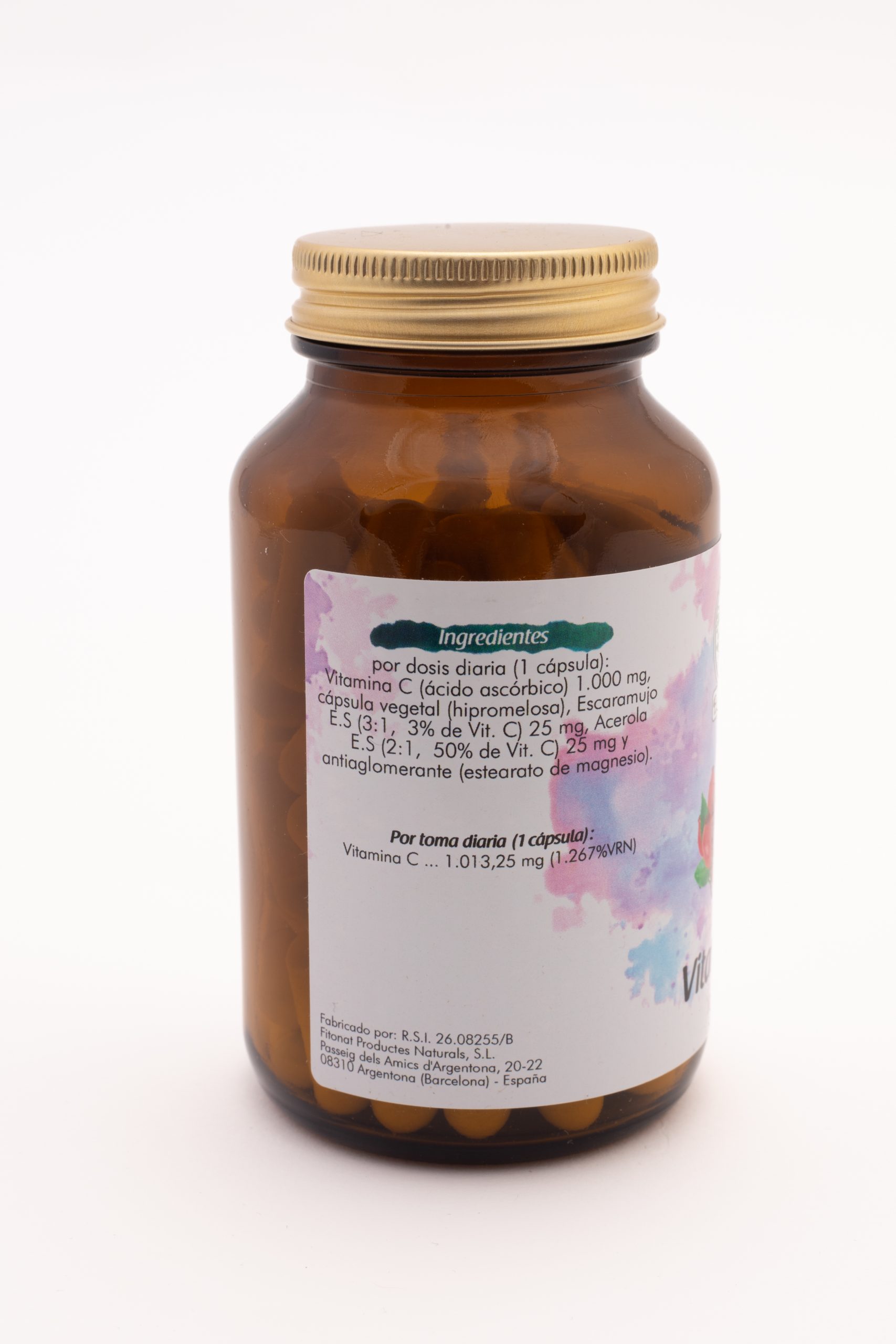 Vitamina C (ácido ascórbico) 1.000 mg, cápsula vegetal (hipromelosa), Escaramujo E.S (3:1, 3% de Vit. C) 25 mg, Acerola E.S (2:1, 50% de Vit. C) 25 mg y antiaglomerante (estearato de magnesio).